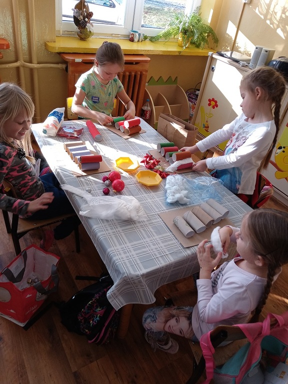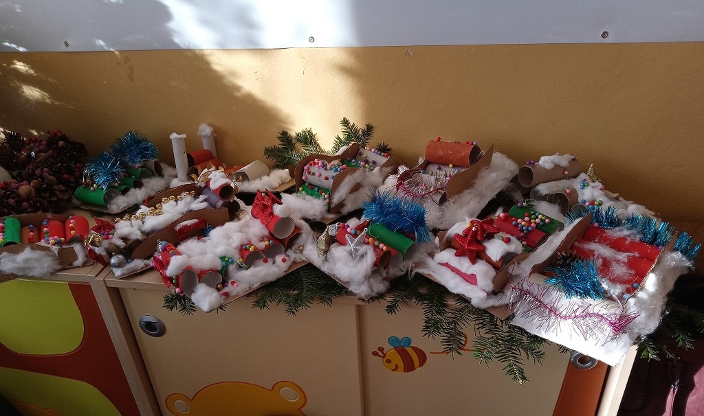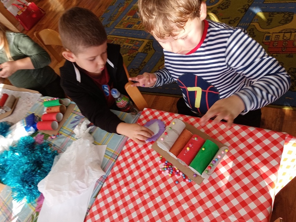 W dniu 11 grudnia 2019r. odbyły się kolejne warsztaty logopedyczno-plastyczne z cyklu „Cztery pory roku” o tematyce świątecznej w grupie przedszkolaków. Zadaniem dzieci było wykonanie pojazdu dla świętego Mikołaja z różnych materiałów zgromadzonych w przedszkolu, np. papierowe rolki, tektura, wata, ozdoby świąteczne itp. Inspiracją do pracy był filmik na youtube „Jak zbudować sanie świętego Mikołaja”. Każdy z przedszkolaków z zapałem wykonał powierzone mu zadanie, a efekty pracy można podziwiać na wystawie. Na koniec zajęć dzieciaki wykonały własne pomoce do ćwiczeń logopedycznych: zrobiły kulki z waty, a następnie zdmuchiwały je z dłoni do pudełka, usprawniając właściwy tor oddechowy. Przedszkolaki bardzo pozytywnie oceniły warsztaty.