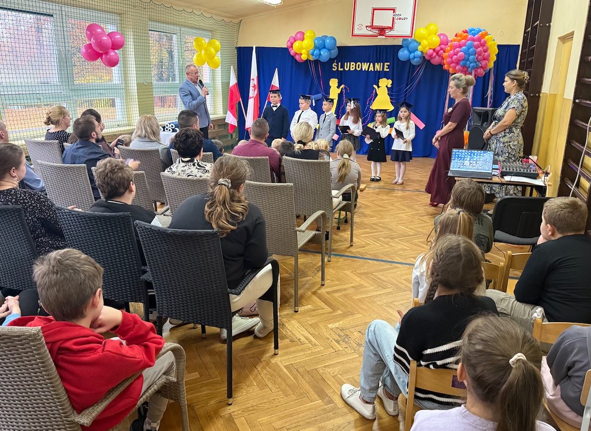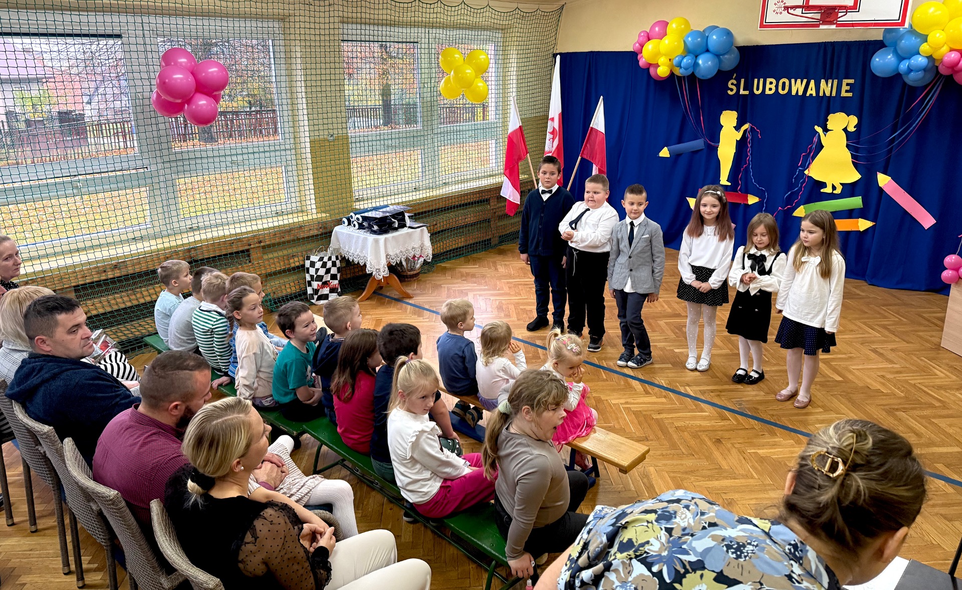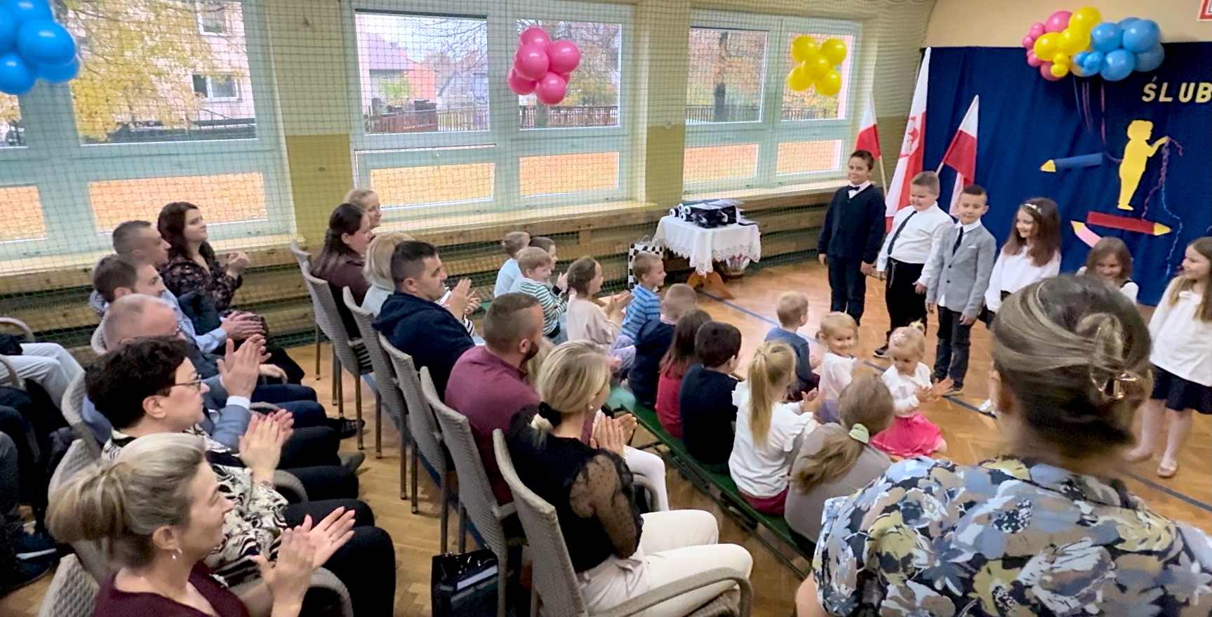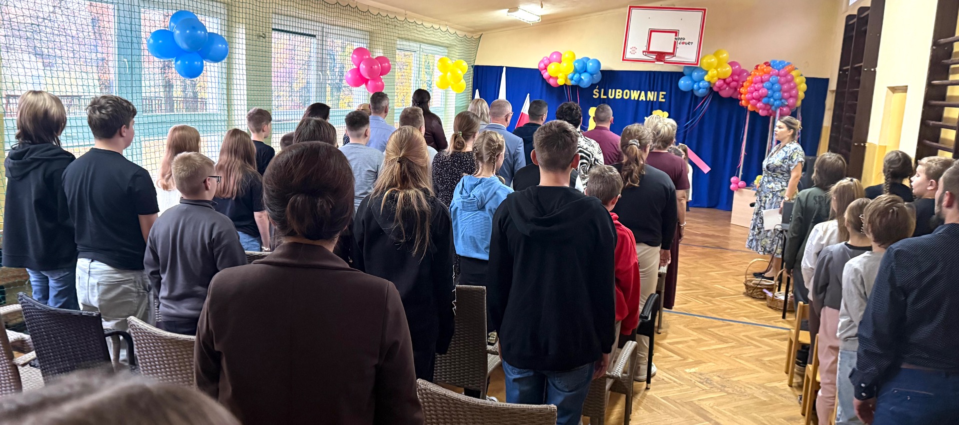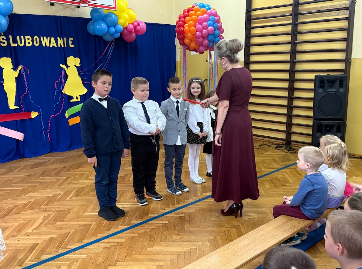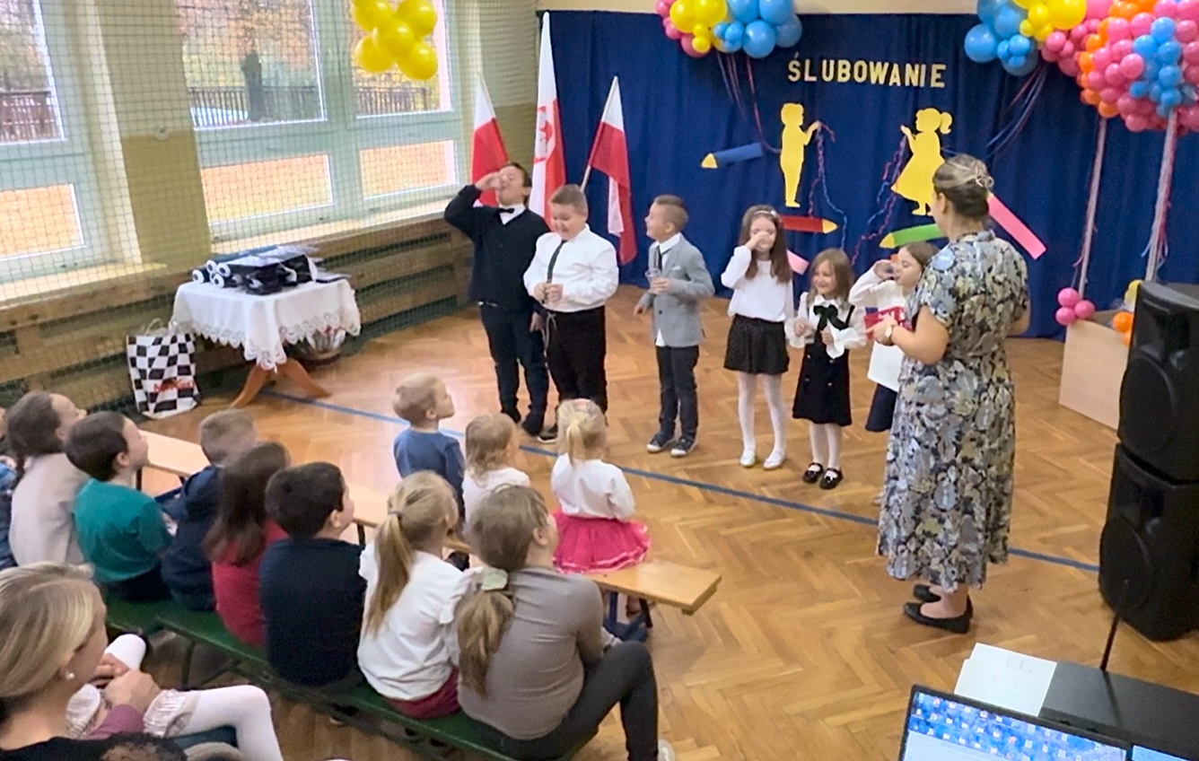 Cała społeczność szkolna z wielką radością przyjęła klasę pierwszą w poczet uczniów.