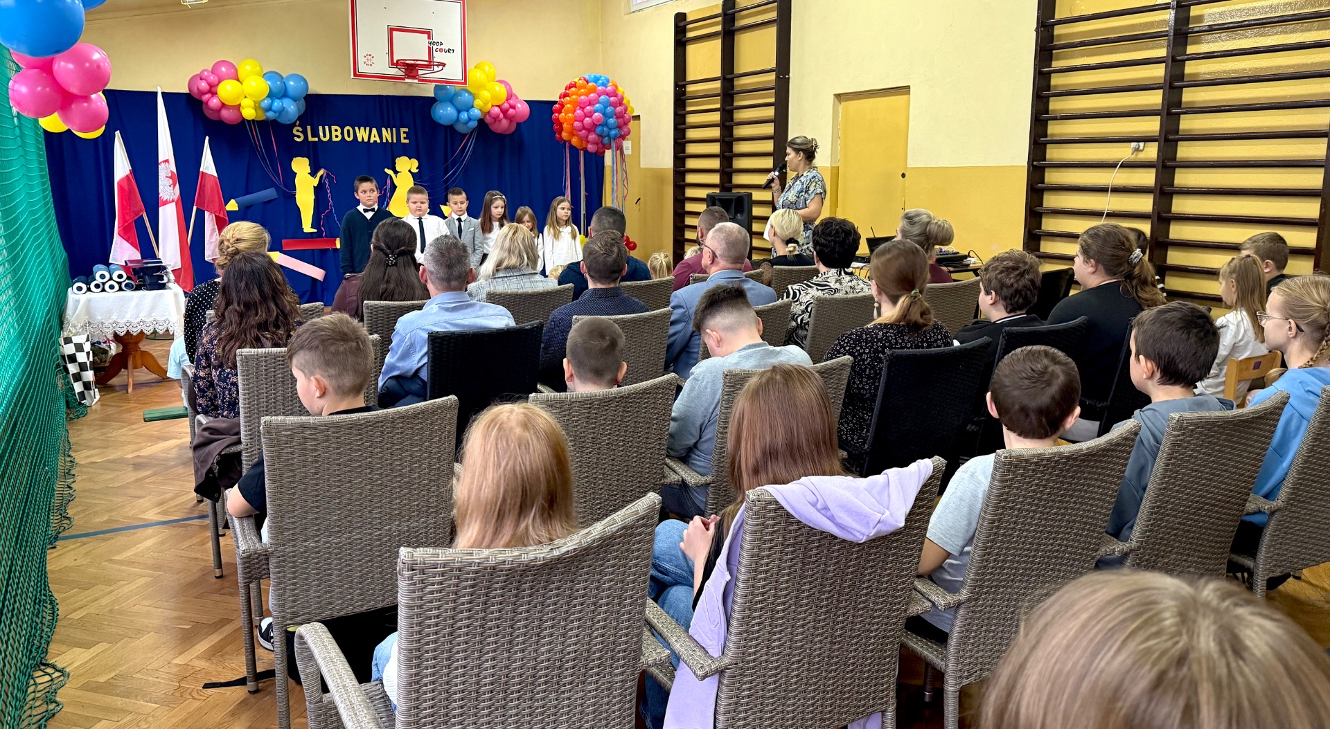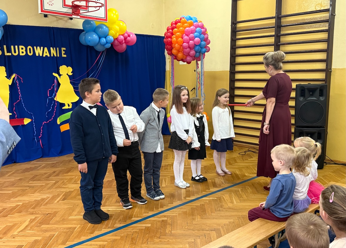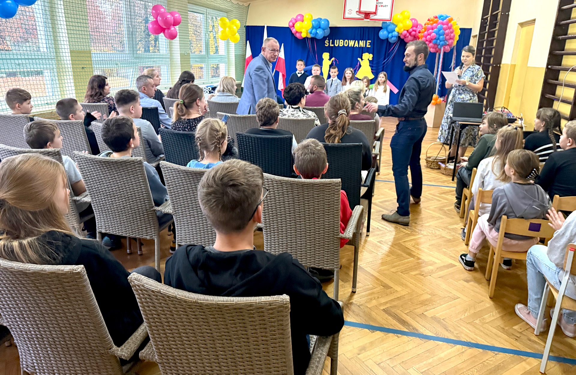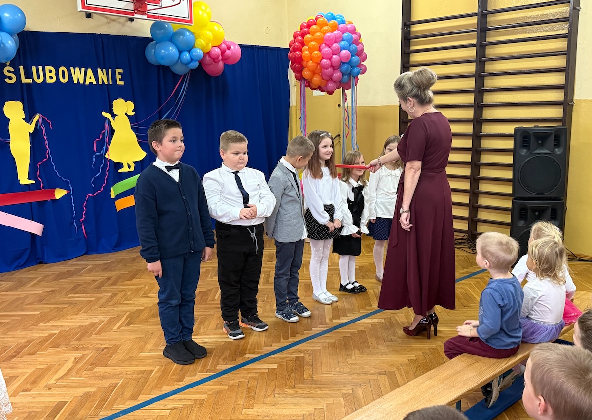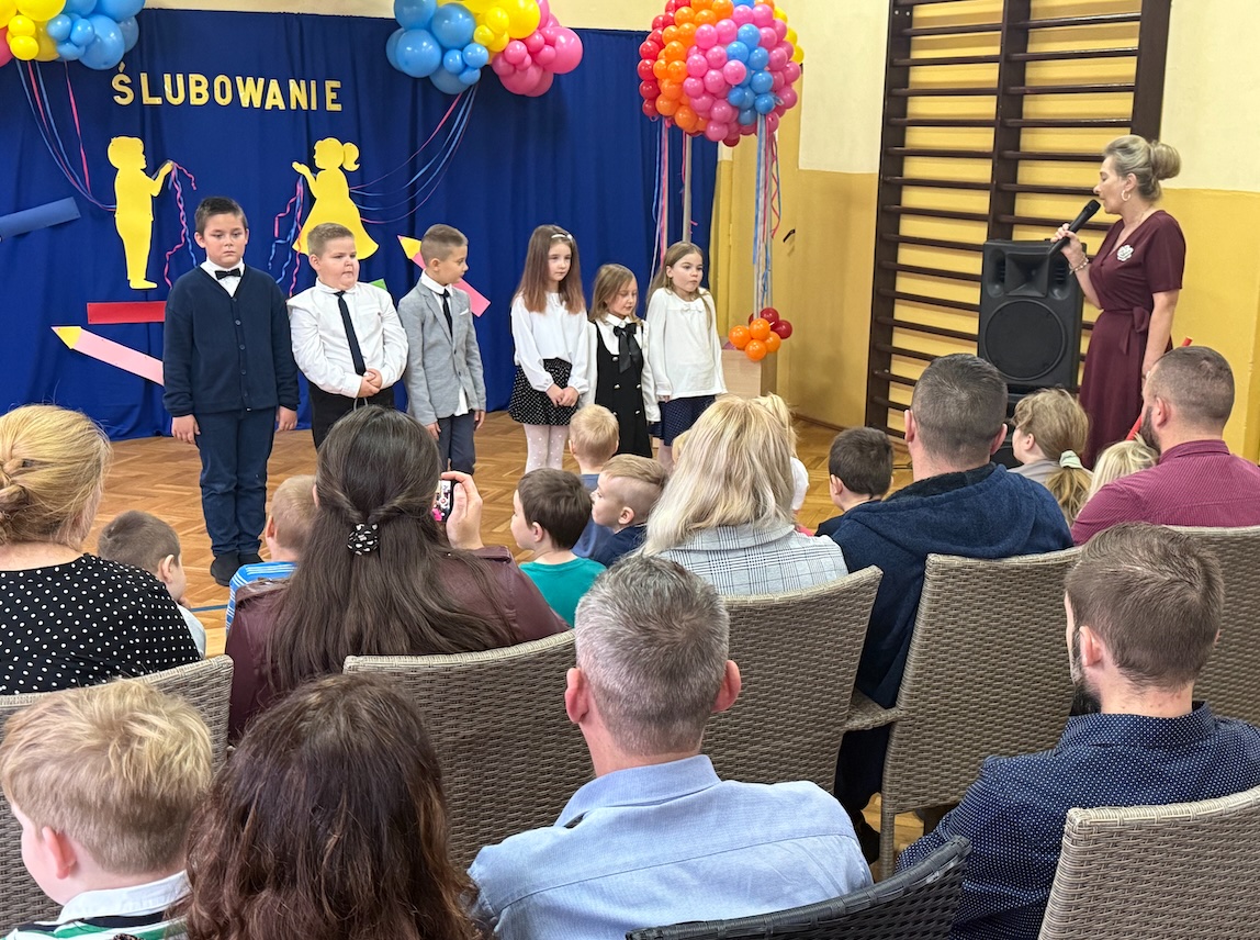 Cała społeczność szkolna z wielką radością przyjęła klasę pierwszą w poczet uczniów.