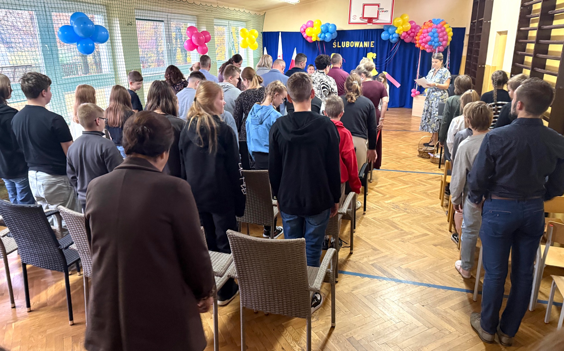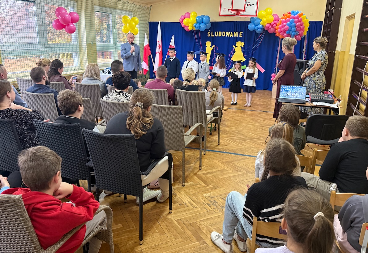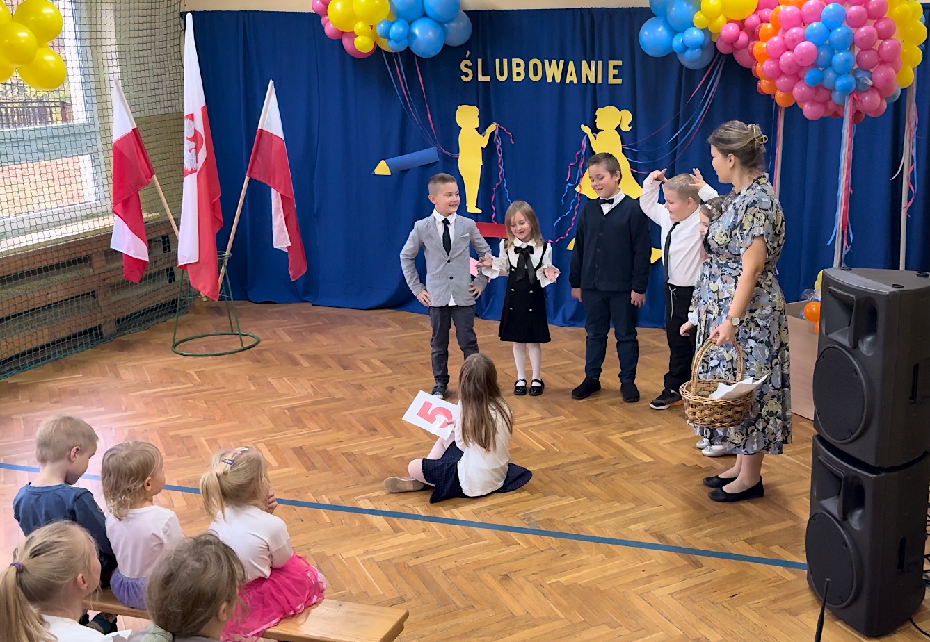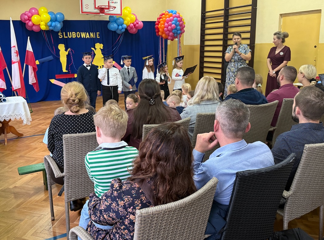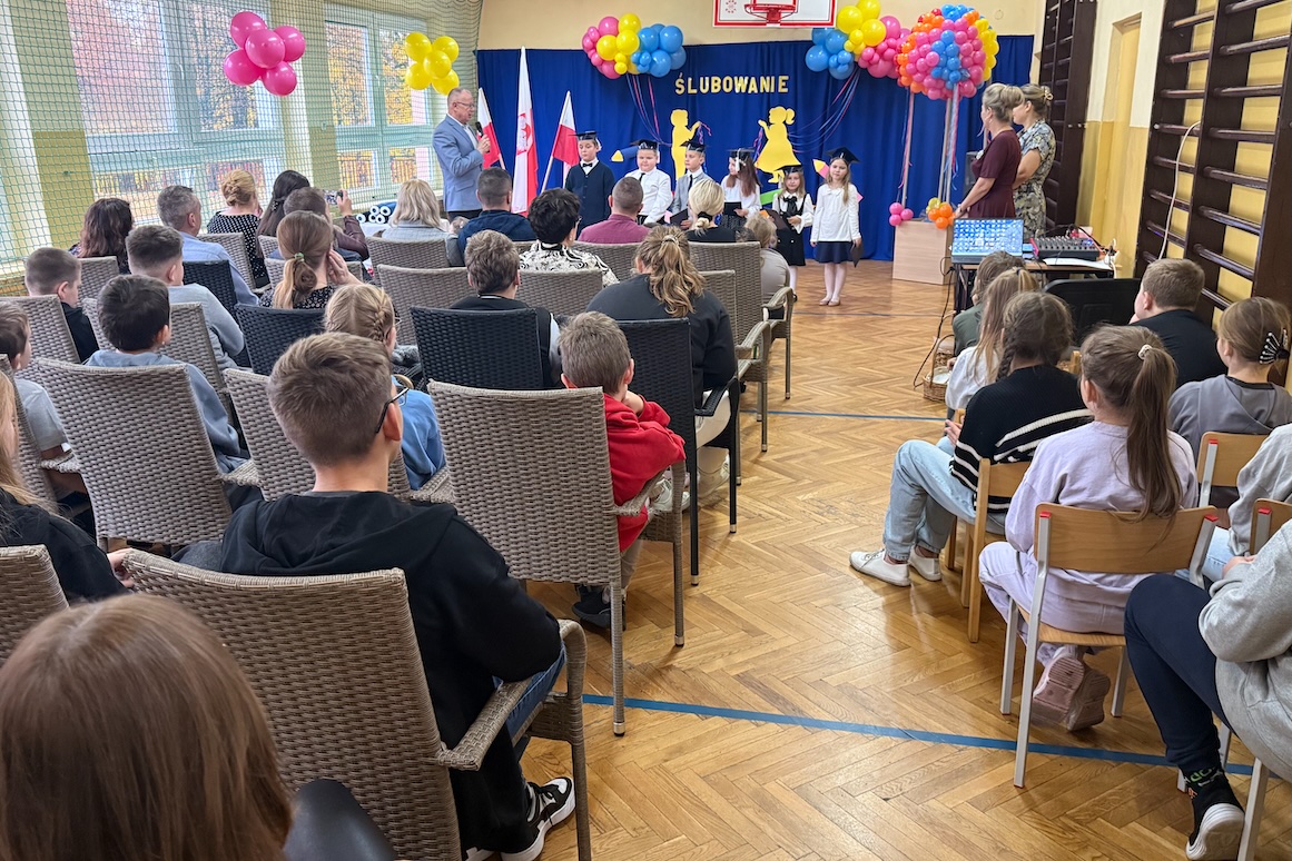 Cała społeczność szkolna z wielką radością przyjęła klasę pierwszą w poczet uczniów.