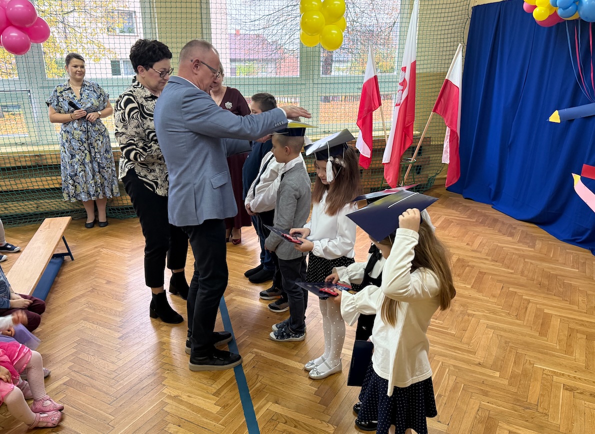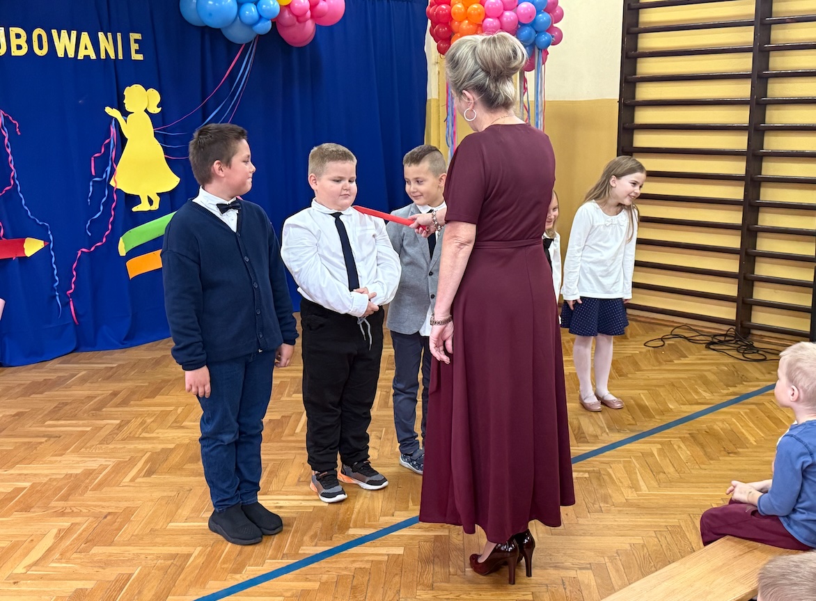 Następnie Dyrektor szkoły, pani Iwona Kolanowska dokonała aktu pasowania uczniów oraz złożyła uczniom życzenia. Na uroczystości gościliśmy pana Mieczysława Zyskowskiego – Sekretarza Gminy Wielgomłyny oraz panią Beatę Kamińską – Kierownik Referatu Oświaty.