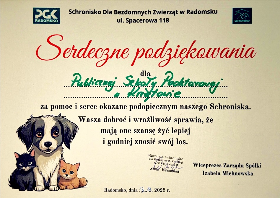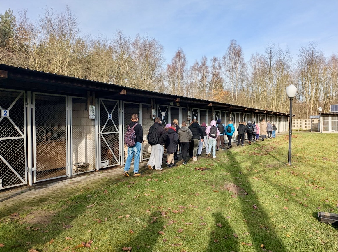 W dniu 13 listopada 2025 r. uczniowie naszej szkoły z klas III-VIII wybrali się na wycieczkę do Schroniska dla bezdomnych zwierząt w Radomsku. Celem wyjazdu było kształtowanie wrażliwości oraz wdrażanie postawy niesienia pomocy potrzebującym zwierzętom. Z ogromną radością przekazaliśmy dla podopiecznych Schroniska zebraną w szkole karmę.